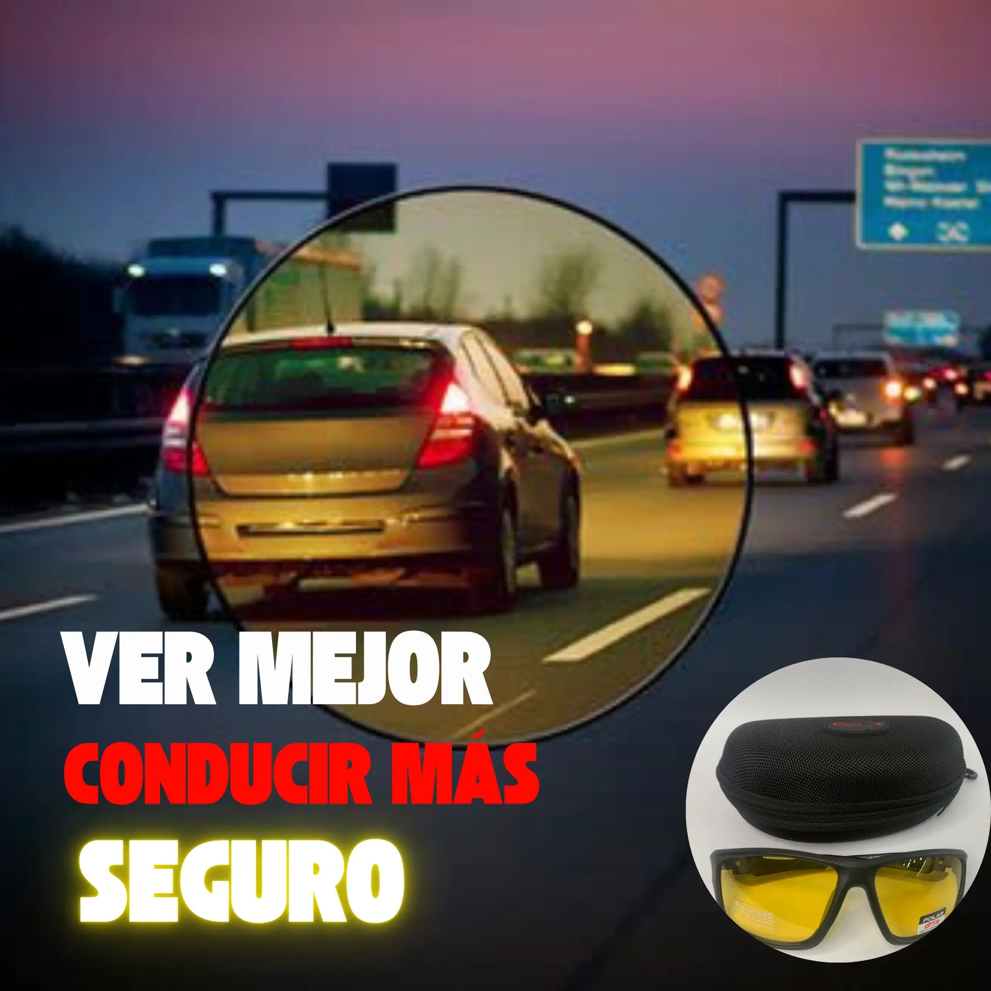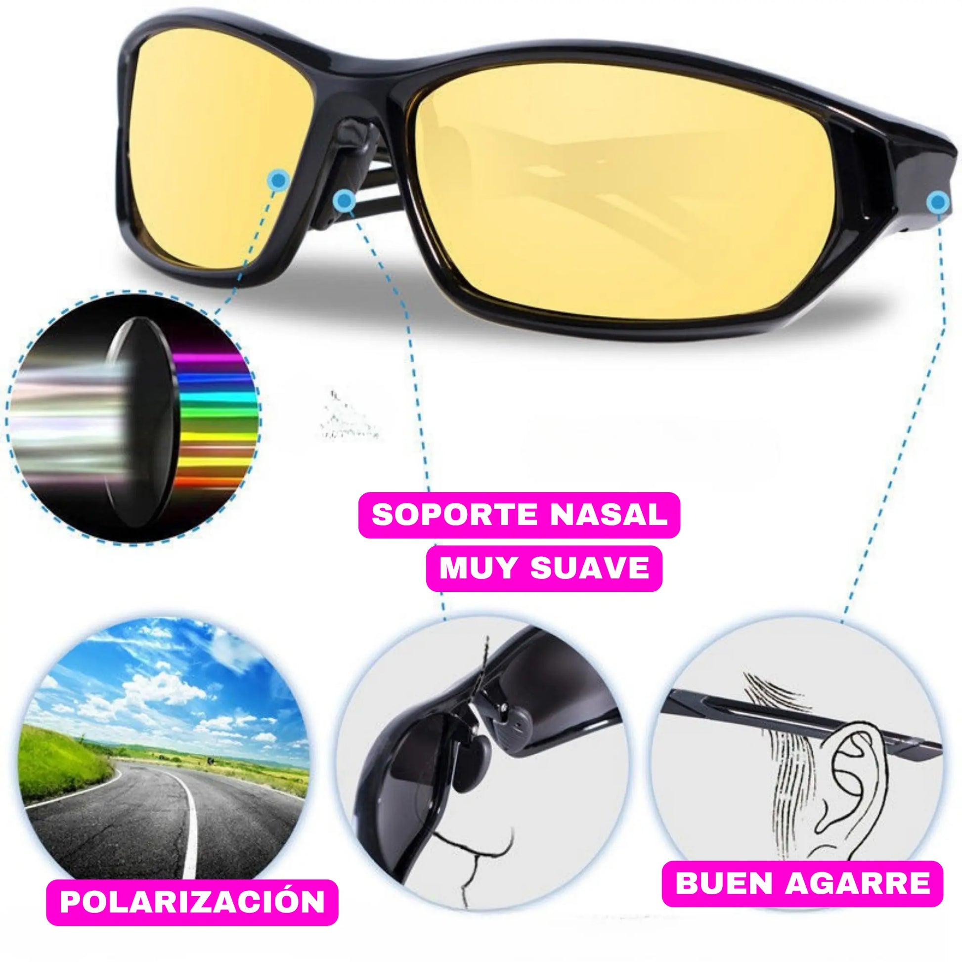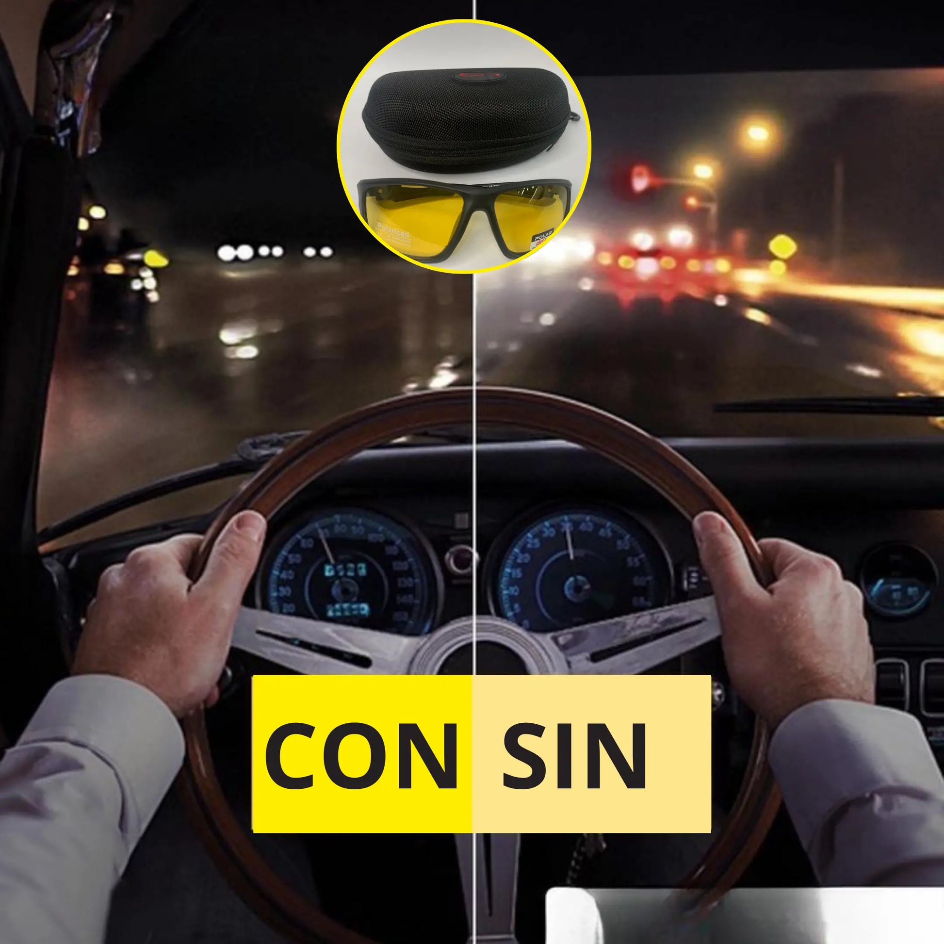 ¡No más luces cegadoras en la carretera! 🌟 Nuestras gafas polarizadas de color amarillo reducen el deslumbramiento intenso , mejoran la visibilidad con poca luz y evitan la fatiga ocular para una conducción más segura y cómoda.